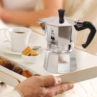 La cafetera italiana Moka está fabricada en aluminio y con barnices de elevada resistencia. Su mango ergonómico es resistente al calor y cuenta con la válvula de seguridad exclusiva de Bialetti.